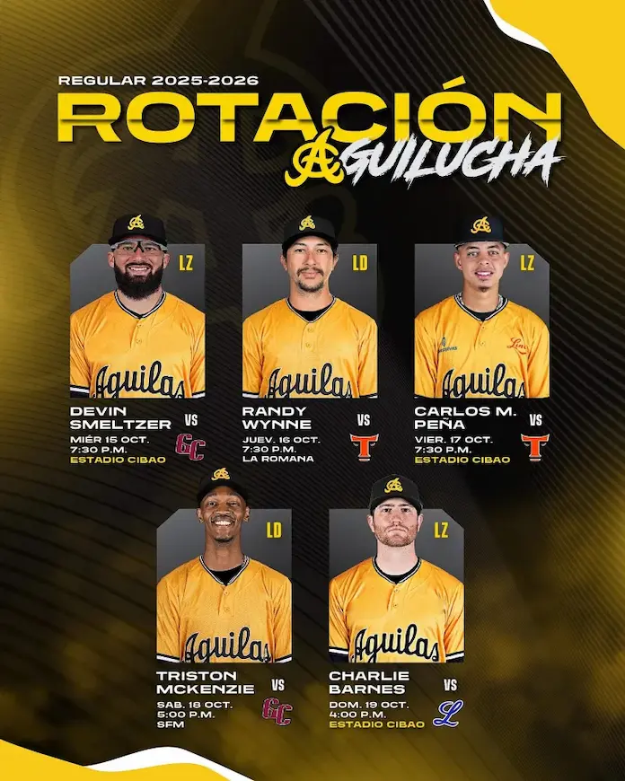 SANTIAGO.-El zurdo importado Devin Smeltzer será el lanzador abridor por las Águilas Cibaeñas en el partido inaugural de la temporada, que se jugará este miércoles a las 7:30 de la noche en el Estadio Cibao, frente a los Gigantes del Cibao, correspondiente al campeonato 2025-2026, dedicado al inmortal de Cooperstown Juan Marichal.