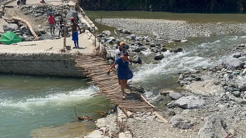 Ante la inacción de las autoridades, los comunitarios han vuelto a improvisar un paso de madera que ya ha sido arrastrado varias veces por las crecidas del río. Algunos hombres se mantienen en el lugar para asistir a quienes cruzan a pie o en motocicleta, recibiendo como compensación una colaboración voluntaria de los usuarios.