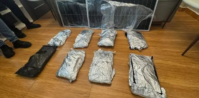 Al aplicar el protocolo de inspección, los agentes procedieron a abrir los paneles solares, encontrando en su interior ocho paquetes envueltos en papel de aluminio y fundas plásticas, con un peso preliminar de unas 11 libras.